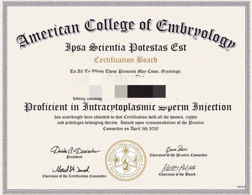 拿到這張證書來自於美國EMBCOL(The American College of Embryology)針對 ICSI(單一精蟲顯微注射)精準熟練度的認証Proficient in Intracytoplasmic Sperm Injection的第一時間,除了家人外,我第一個分享這個喜悅的人就是學姊,非常感謝學姊這段時間的教導。