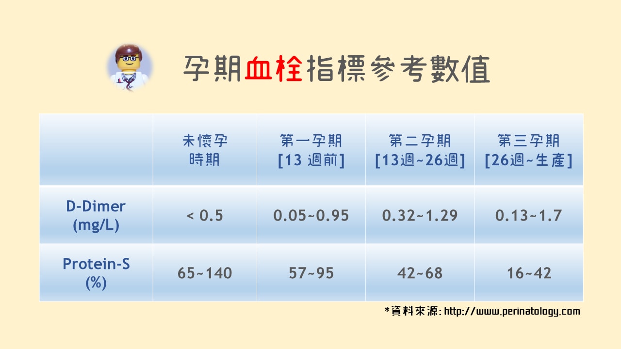而在凝血系統方面的變化,懷孕時則會偏向「易凝血 = 好發血栓」的體質。所以簡單來說,今天不論是否為免疫媽媽,身體在懷孕時就比較會有血栓的傾向,而且在不同懷孕週數的孕期血栓植參考標準也都不同喔!