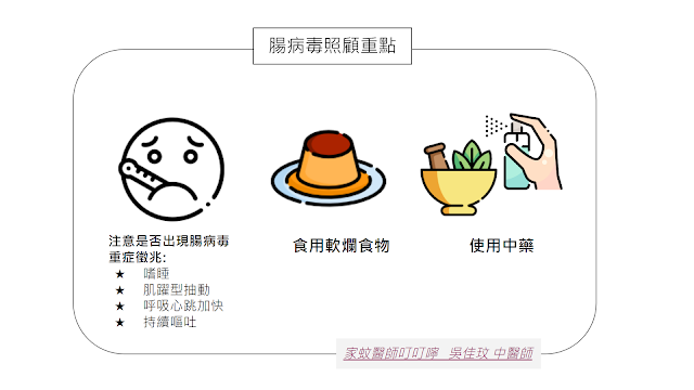 在照顧輕症的兒童最苦惱的就是口咽部的潰瘍,會導致孩童因疼痛而減少飲食意願。除了在這段時間服用較軟爛的食物、降低食物的溫度減少刺激外,中醫有可用於口腔的液體噴嚏與粉狀的藥物可以使用,不只可以迅速地達到止痛的效果,也可讓孩痛較快恢復正常的飲食,配合服用中藥也可縮短病程。通常腸病毒的病程約七、八天,如果使用中藥的話,可以縮短至三到五天,甚至更短的時間。若您的孩童不幸感染腸病毒,看中醫也可以是您的一個選擇。